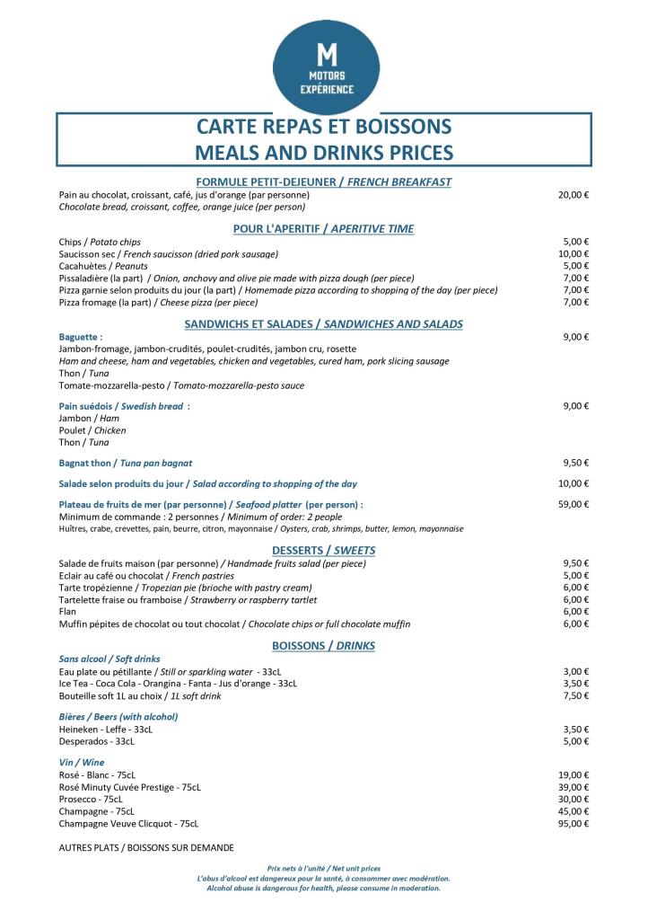 Boissons chips cacahuètes disponible. Les repas sont uniquement sur réservation.